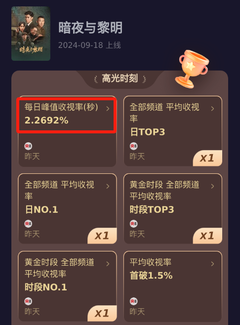 《暗夜与黎明》上星央八黄金档,首日仅放出了一集,收视率竟然直接破2,成为当之无愧的全国收视冠军。