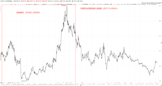 图3:华海药业后复权股价走势图(2017.12~2024.5)及广发聚瑞持仓情况