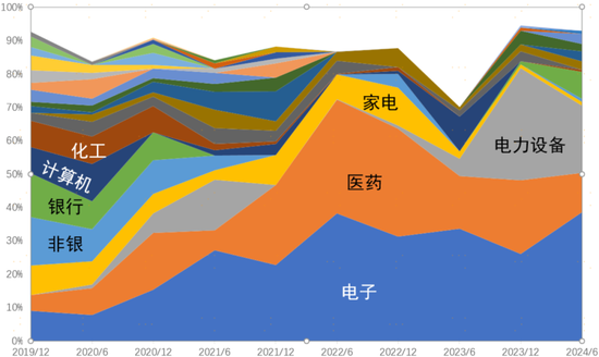 此后,在2022年末、2023年6月末,这一比值均在20%以上;2023年末有所下滑后,2024年6月末再次达到27.87%。(为了更全面地看清持仓变化,此处以半年报和年报数据进行分析)